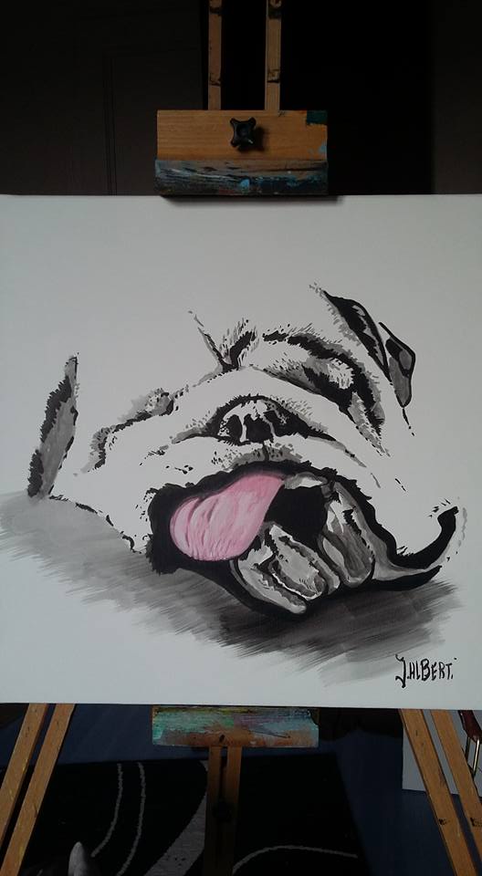 peintre animalier peinture toile tableau bulldog bully portrait repos sommeil sieste langue tirée nuit fatigue noir et blanc bichromie artiste peintre peintre animalier parent et enfant