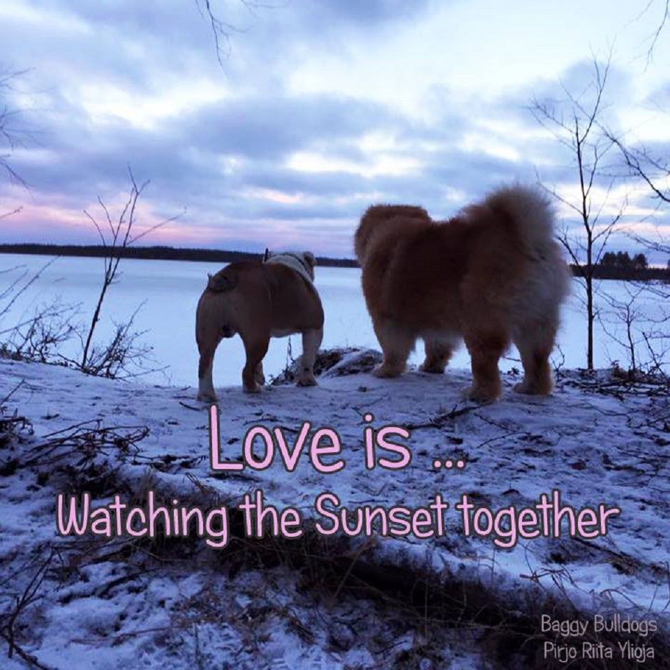 kdo offert love amour bulldog bully chien chiot chow chow neige hiver coucher de soleil sunset définition ensemble together regarder watching toile
