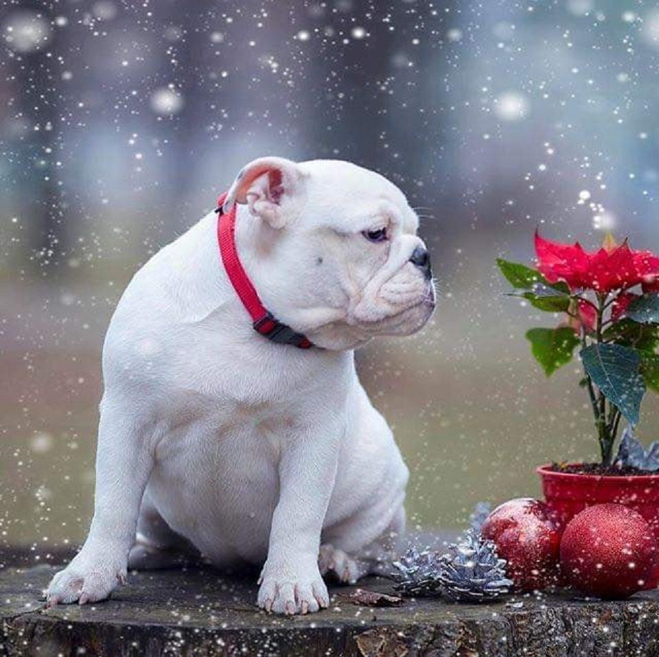 neige noel bulldog bully neige froid flocons de neige étoile de noel poinsettia fleurs de noel boules de noel guirlande de noel gourmandise