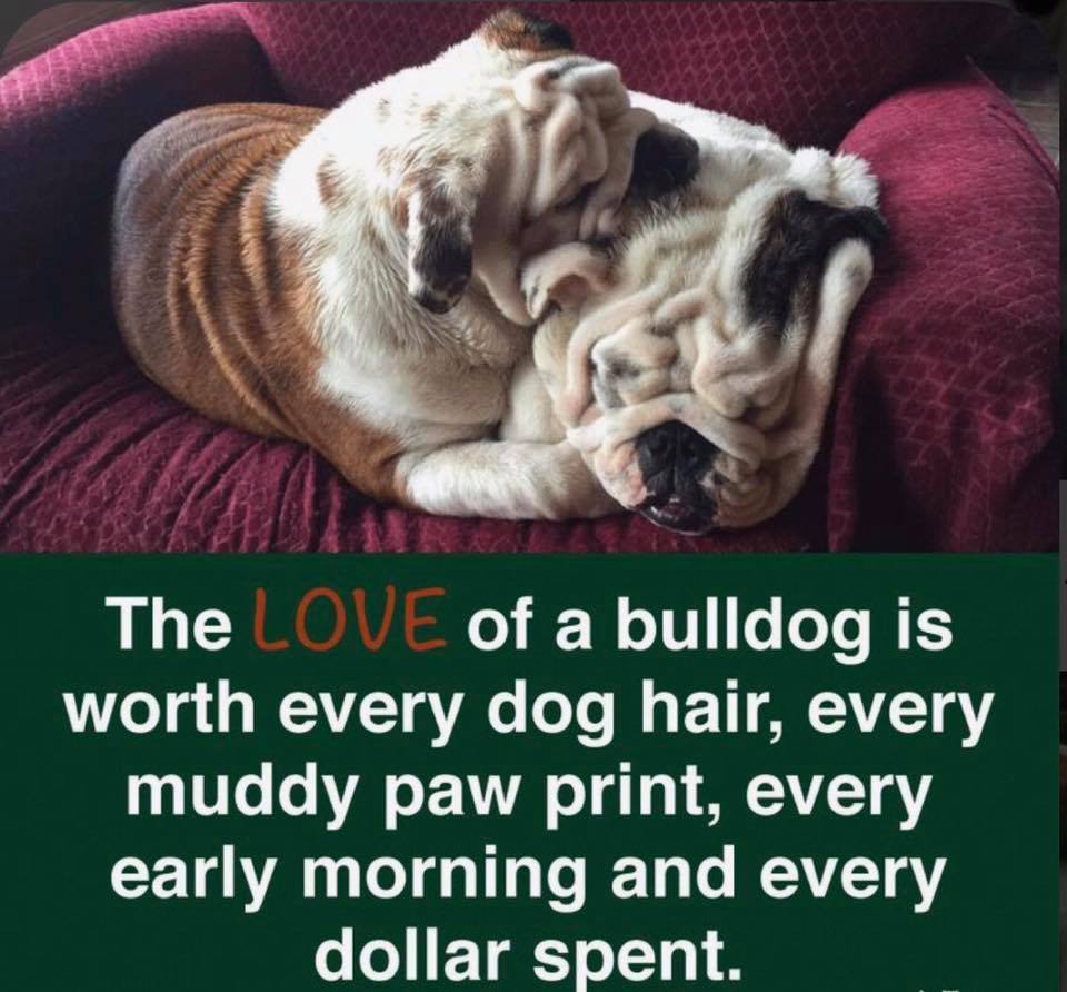 "L'AMOUR d'un bulldog vaut chaque poil de chien, chaque empreinte de patte boueuse, chaque matin trop matinal et chaque dollar dépensé"