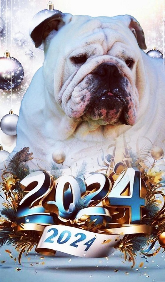 bonjour bonne année nouvel an bulldog bully 2024 boule de noel neige sapin créa perso kdo offert jeu