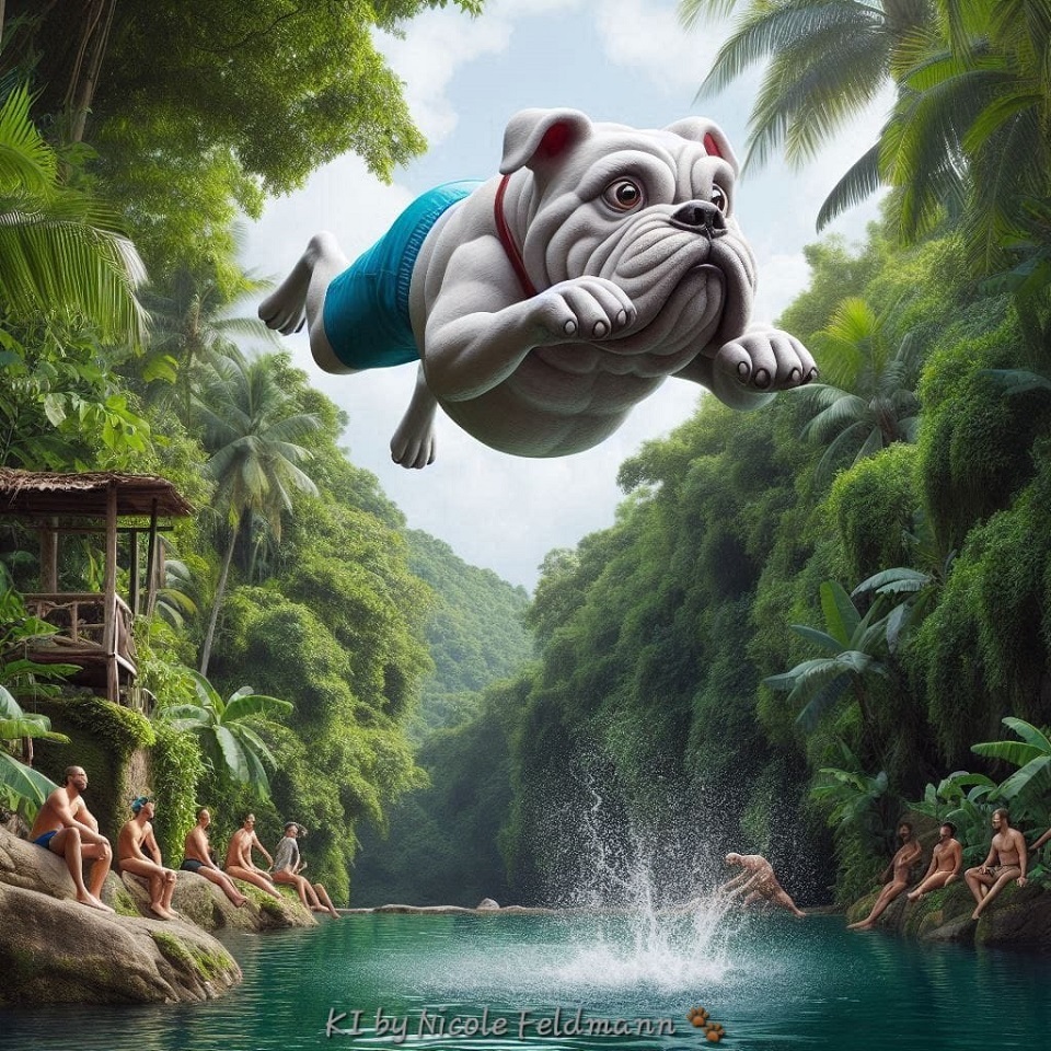 lac loisirs bulldog bully plaisir natation baignade plongeon short de bain vacances rivière lac piscine peinture