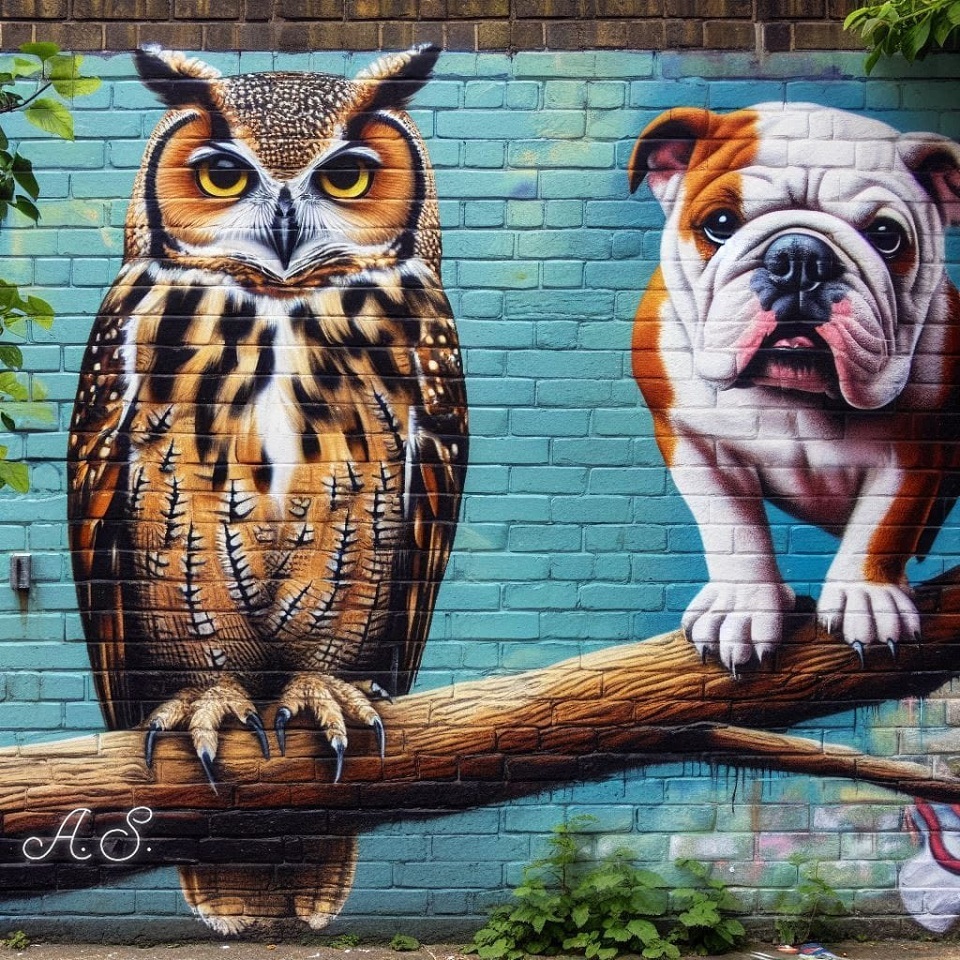 duo en cie bulldog bully oiseau nocturne hibou amical