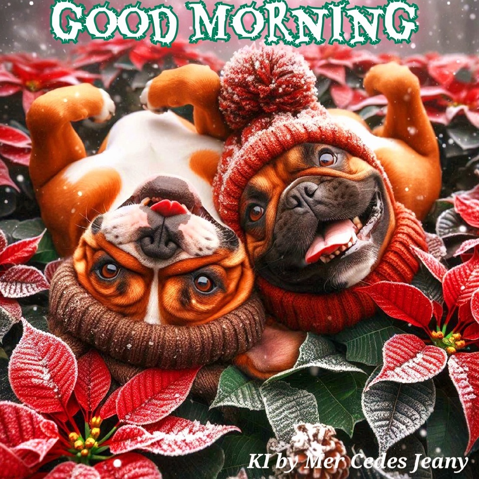 belle image de bully bonjour bulldog bully bouledogue good morning hiver froid neige givre bonnet noel poinsettia fleurs roses de noel repos