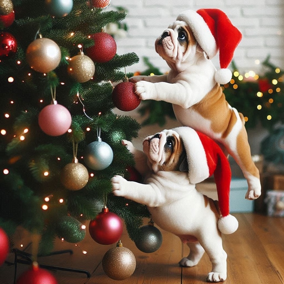 neige noel bulldog bully duo couple fratrie sapin boules de noel illuminations bonnet de noel bonjour