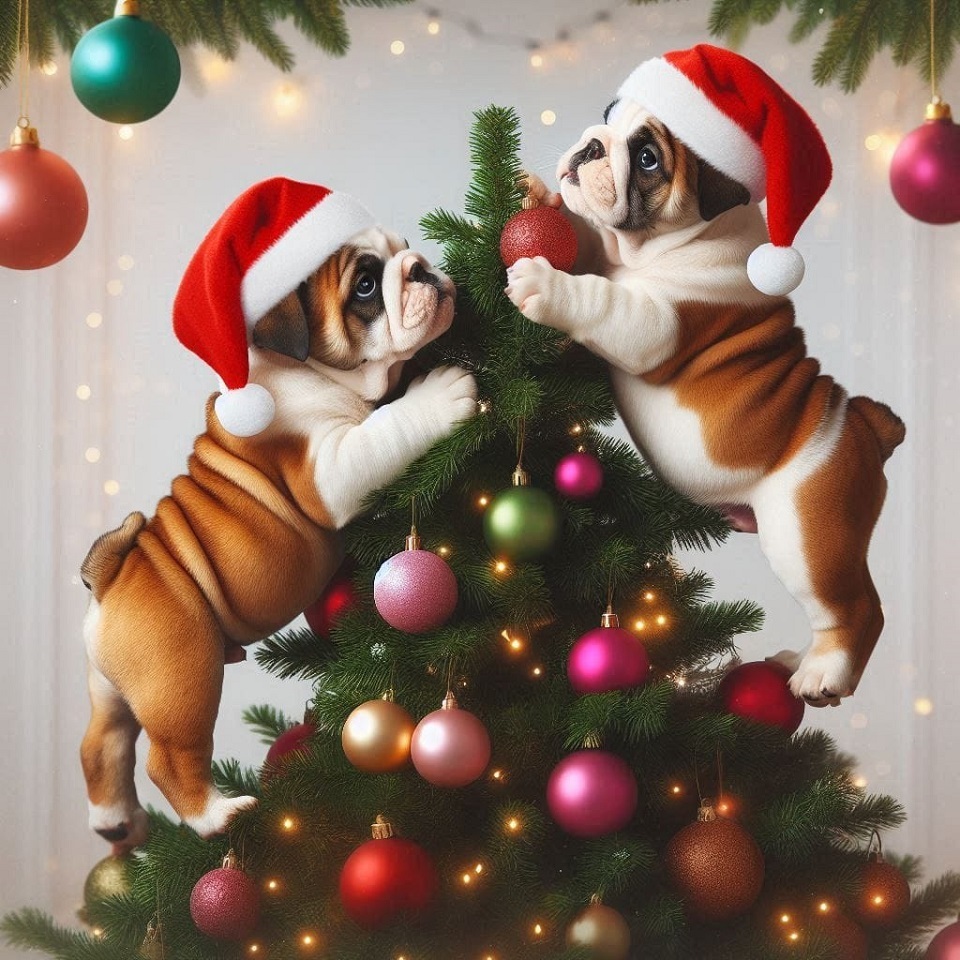 neige noel bulldog bully fratrie couple duo bonnet de noel sapin boules de noel illuminations humour