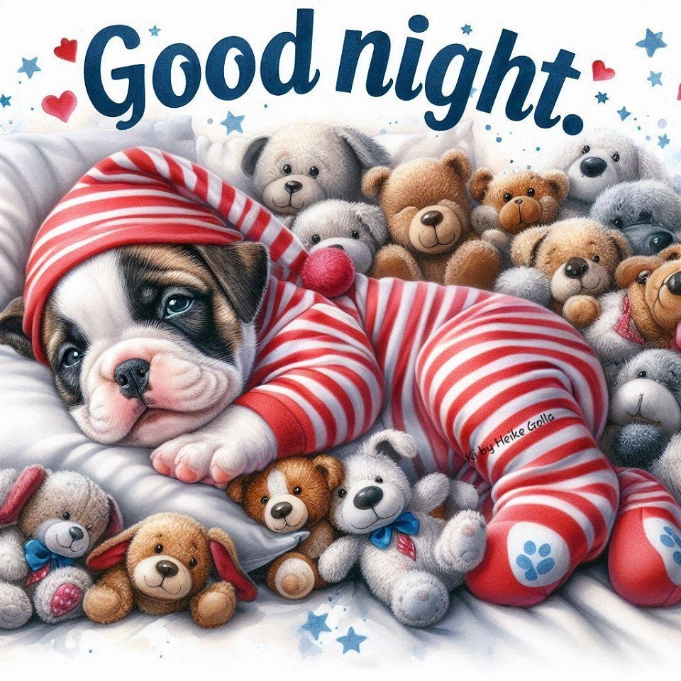 bonjour bonne nuit bulldog bully good night au lit sur le lit oreiller couché allongé pyjama bonnet de nuit peluches doudous coeur étoile enfant