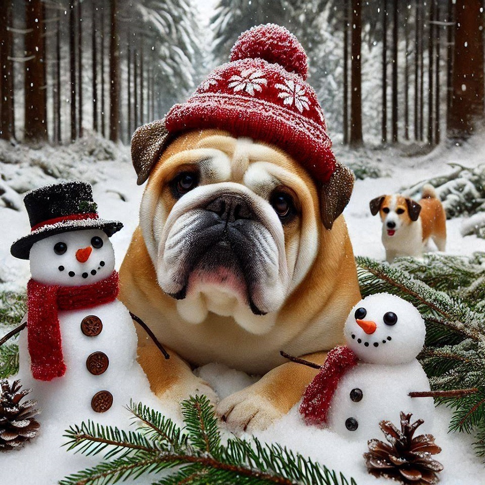gourmandise hiver neige bulldog bully foret froid bonnet en cie chien chiot bonhomme de neige belle image de bully