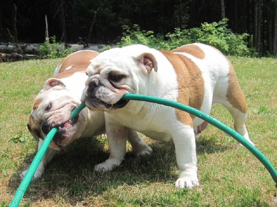 costume couple bulldog bully chien chiot jardin jardinage arrosage appetit