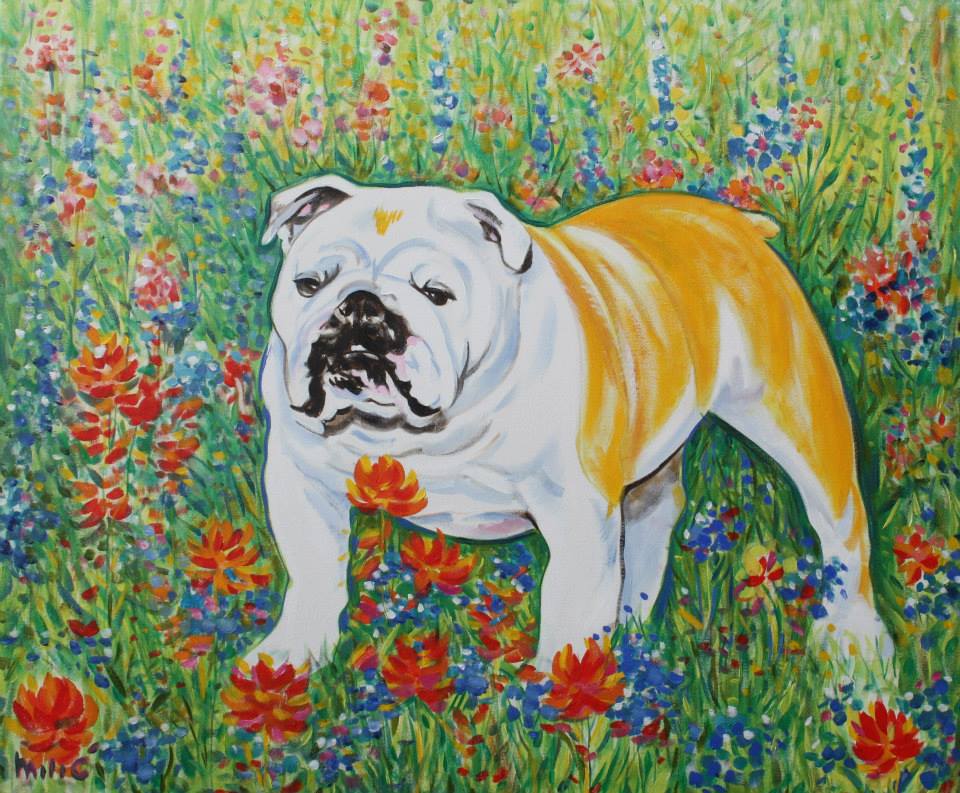 peintre animalier peinture toile tableau bulldog bully fleur fleur rouge fleur bleue artiste peintre appetit